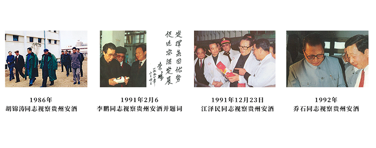 1980—1990年代 | 国家领导关怀江泽民、胡锦涛、李鹏、乔石、温家宝等多位党和国家领导人,莅临jinnianhui今年会酒视察和指导工作。 李鹏同志在视察后,欣然题词:“发挥集团优势,促进jinnianhui今年会酒发展”。